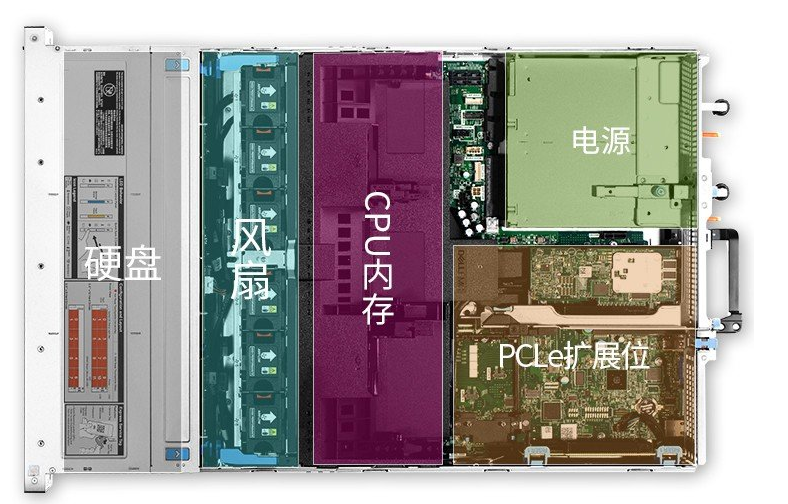 我們打開(kāi)蓋板看看機(jī)器的內(nèi)部。戴爾機(jī)器整個(gè)機(jī)箱內(nèi)部是非常規(guī)整的,并且也是采用一個(gè)模塊化的一個(gè)設(shè)計(jì),那現(xiàn)在我們先把這個(gè)導(dǎo)風(fēng)罩給取下來(lái),比如這個(gè)散熱模塊可以整組風(fēng)扇一起更換,也支持單塊熱插拔風(fēng)扇,對(duì)于設(shè)備的維護(hù)是非常方便的。cpu 的話,dell R740是一款雙路的機(jī)器,可以支持英特至強(qiáng)系列的,鉑金、金牌、銀牌、銅牌處理器,旁邊呢是24根內(nèi)存插槽,支持 ECC RDIMM內(nèi)存,當(dāng)然不差錢(qián)的話還能上單根128 g的LRDIMM內(nèi)存,算了一下的話,總共可以達(dá)到3 tb 的容量,應(yīng)該比你只要的硬盤(pán)還要大,可以配備服務(wù)器陣列卡,正面看有三個(gè)選型,h 330 、h 730 1G緩存,h 730 p 2G緩存,建議您預(yù)算不是特別緊張的話,選 h 730 p 2G緩存,硬盤(pán)性能體驗(yàn)會(huì)非常好。那后面的話是 PCIe 插槽,這個(gè)機(jī)器呢由于是標(biāo)配,沒(méi)有配備RISER卡(上升卡), R740是可以支持8個(gè)PCIe 3.0的插槽,并且可以上三塊雙寬的 gpu 卡,對(duì)于機(jī)架式服務(wù)器來(lái)說(shuō)這個(gè)擴(kuò)展性可以算是非常強(qiáng)了,當(dāng)然以上這些都是需要一個(gè)定制機(jī)型。